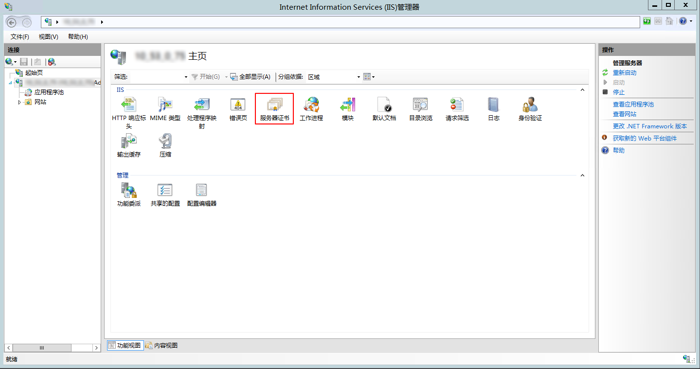 打开 IIS 服务管理器,选择计算机名称,双击打开 “服务器证书”。如下图所示: