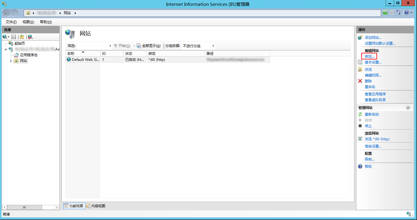选择网站下的站点名称,并单击右侧 “操作” 栏的绑定。如下图所示: