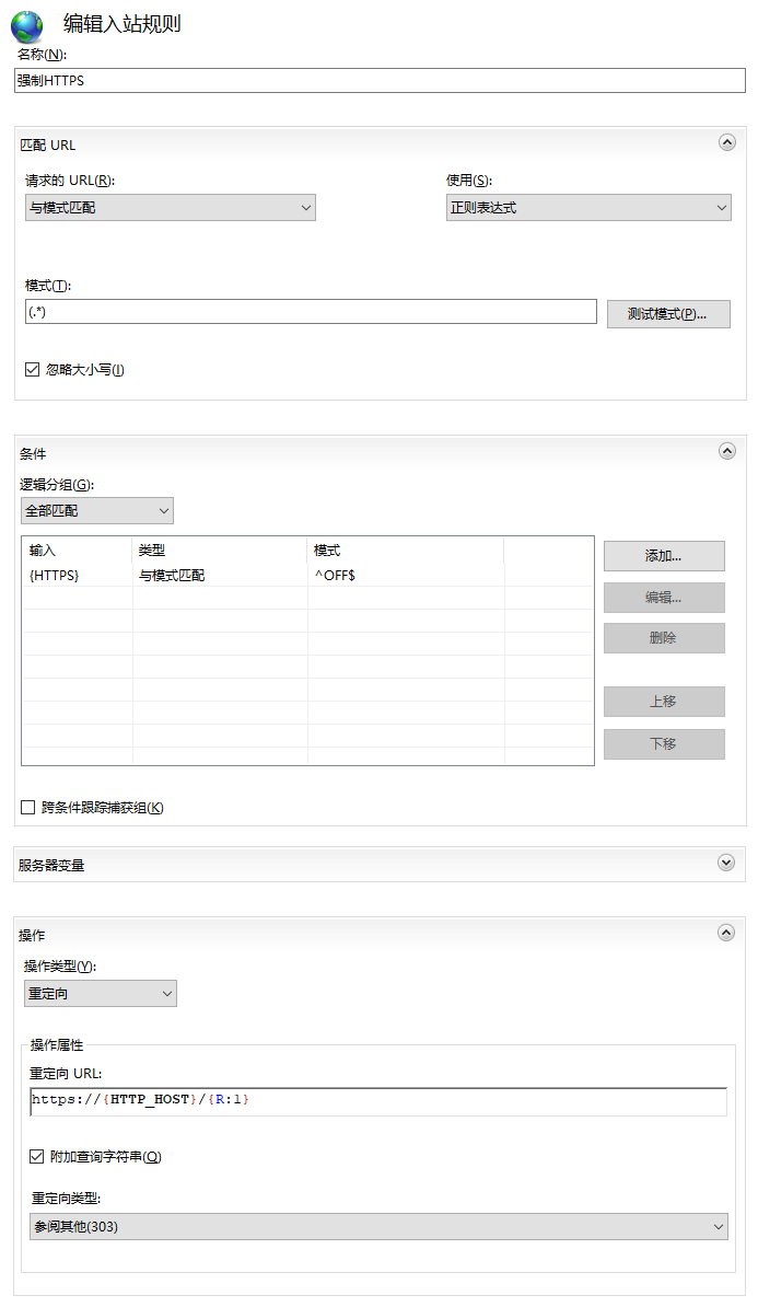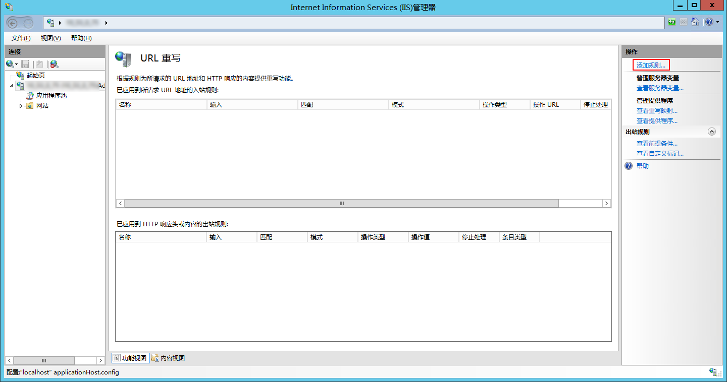 进入 “URL 重写” 页面,并单击右侧 “操作” 栏的添加规则。如下图所示:
