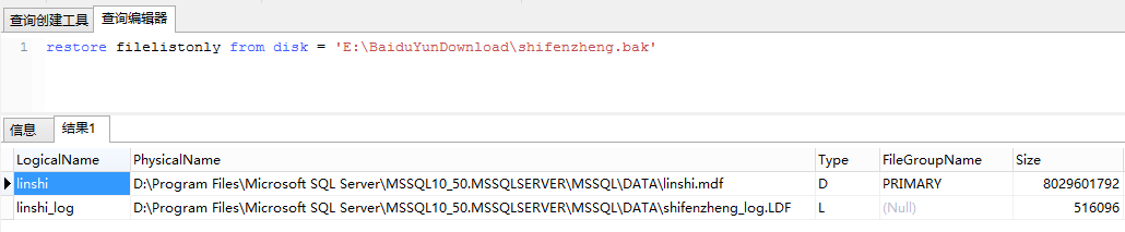 1 | restore filelistonly from disk = 'E:\BaiduYunDownload\shifenzheng.bak'
