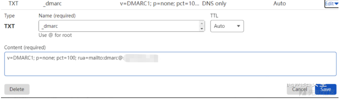 添加方法就是增加一条 _dmarc 的 TXT 解析,内容为配置选项,v=DMARC1; p=none; pct=100; rua=mailto:dmarc@mydomain.com