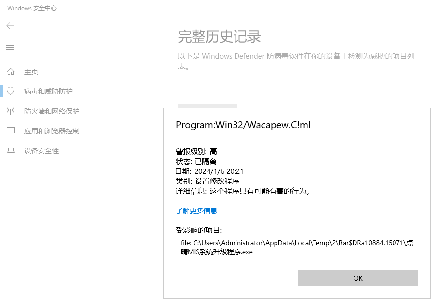 :点晴MIS系统升级时Windows Defender提示检测到Program:Win32/Contebrew.A!ml病毒,如何解决?