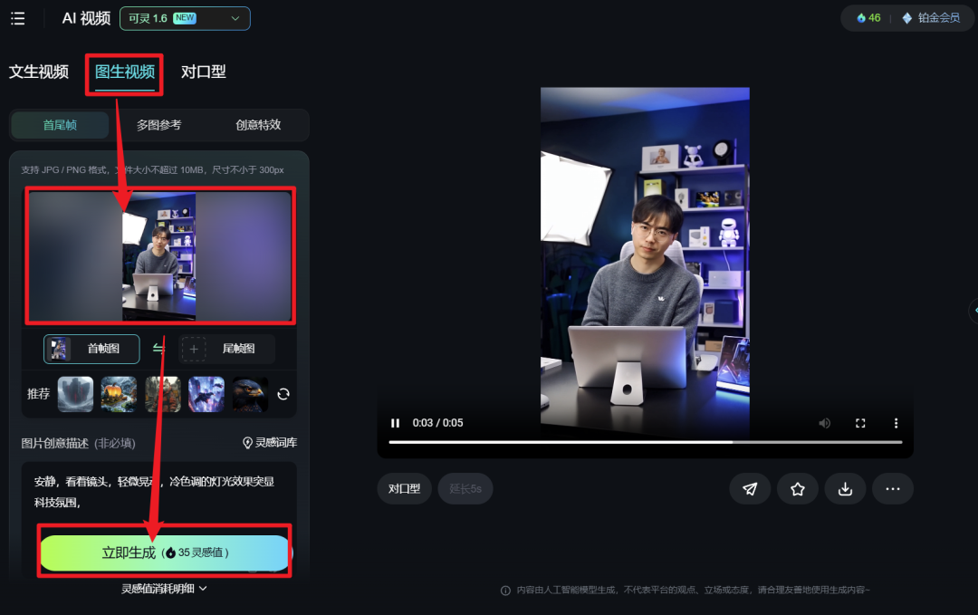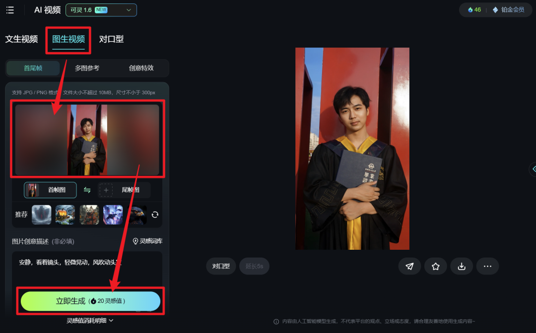 上传照片并完成描述后,点击“立即生成”,就能得到我们想要的视频。