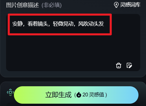 接着在图片创意描述处输入相关描述,比如让人物动起来,描述其眼神状态等。
