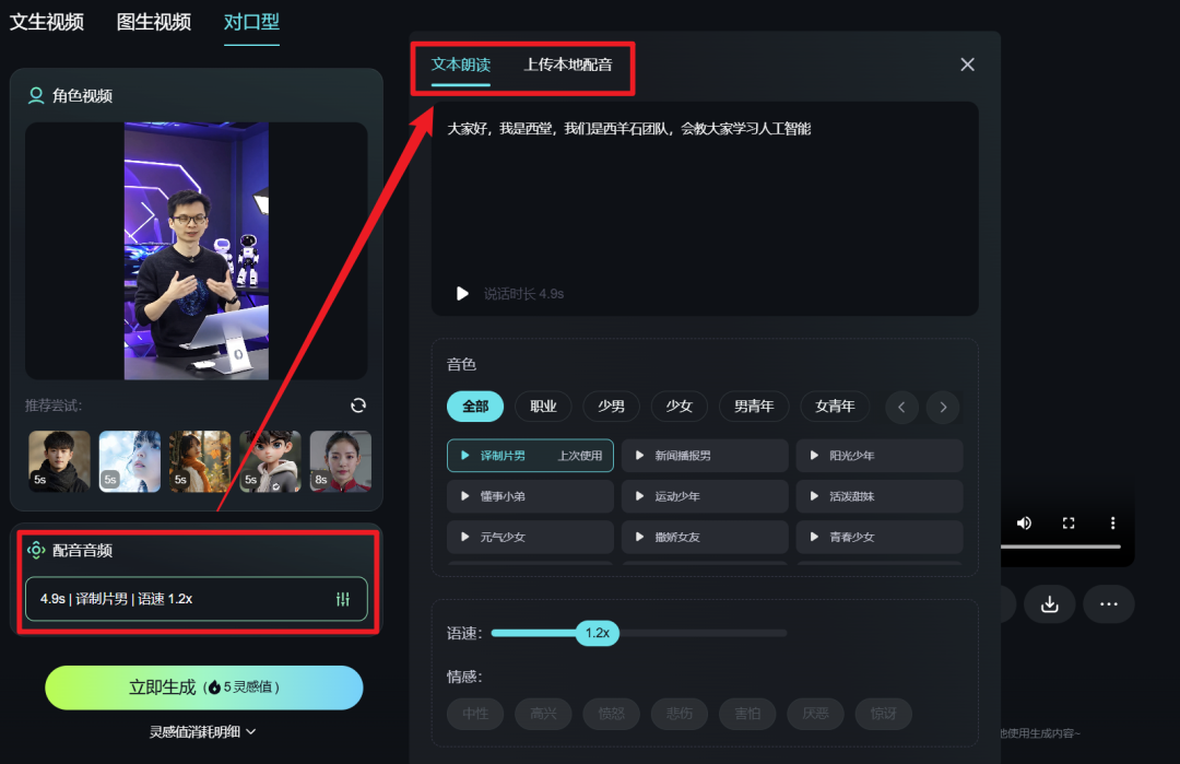 如果选择 文本驱动,还能挑选音色,输入想说的文本就能生成数字人讲解这段话的视频。