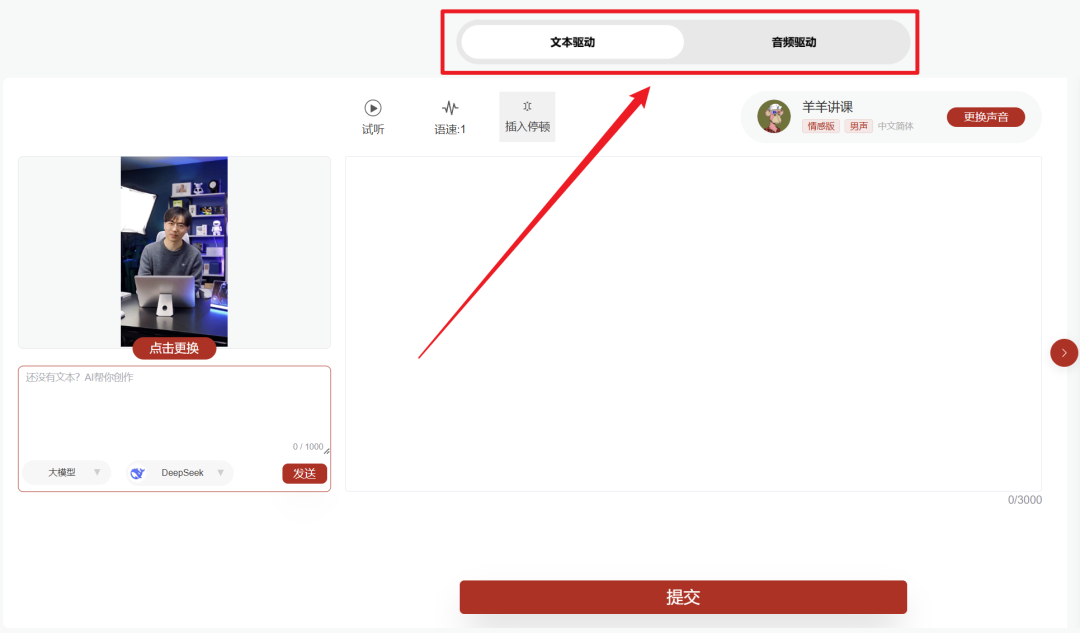 点击“对口型”后,在左边上传视频,配音音频有文本驱动和声音驱动两种方式可选。