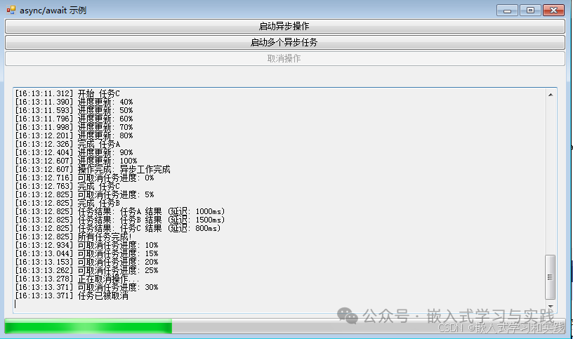 private async void btnStartMultiple_Click(object sender, EventArgs e) { LogMessage("开始多个异步任务..."); btnStartMultiple.Enabled = false; try { var task1 = DoAsyncWorkWithName("任务A", 1000); var task2 = DoAsyncWorkWithName("任务B", 1500); var task3 = DoAsyncWorkWithName("任务C", 800); string[] results = await Task.WhenAll(task1, task2, task3); foreach (string result in results) { LogMessage($"任务结果: {result}"); } LogMessage("所有任务完成!"); } catch (Exception ex) { LogMessage($"任务出错: {ex.Message}"); } finally { btnStartMultiple.Enabled = true; } } private async Task<string> DoAsyncWork(IProgress<int> progress) { return await Task.Run(() => { for (int i = 0; i <= 100; i += 10) { if (cancellationTokenSource?.Token.IsCancellationRequested == true) { throw new OperationCanceledException(); } System.Threading.Thread.Sleep(200); progress?.Report(i); } return "异步工作完成"; }); } private async Task<string> DoAsyncWorkWithName(string taskName, int delay) { LogMessage($"开始 {taskName}"); await Task.Run(() => { System.Threading.Thread.Sleep(delay); }); LogMessage($"完成 {taskName}"); return $"{taskName} 结果 (延迟: {delay}ms)"; } private async Task StartCancellableWork() { cancellationTokenSource = new System.Threading.CancellationTokenSource(); btnCancelOperation.Enabled = true; try { var progress = new Progress<int>(percent => { progressBar.Value = percent; LogMessage($"可取消任务进度: {percent}%"); }); string result = await DoCancellableWorkAsync(progress, cancellationTokenSource.Token); LogMessage($"可取消任务完成: {result}"); } catch (OperationCanceledException) { LogMessage("任务已被取消"); } finally { btnCancelOperation.Enabled = false; cancellationTokenSource = null; } } private async Task<string> DoCancellableWorkAsync(IProgress<int> progress, System.Threading.CancellationToken cancellationToken) { return await Task.Run(() => { for (int i = 0; i <= 100; i += 5) { cancellationToken.ThrowIfCancellationRequested(); System.Threading.Thread.Sleep(100); progress?.Report(i); } return "可取消任务完成"; }, cancellationToken); } private void btnCancelOperation_Click(object sender, EventArgs e) { if (cancellationTokenSource != null) { cancellationTokenSource.Cancel(); btnCancelOperation.Enabled = false; LogMessage("正在取消操作..."); } } }}