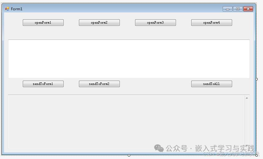 using MultiWindowCommunication.Forms;using MultiWindowCommunication.Message;using System;using System.Collections.Generic;using System.ComponentModel;using System.Data;using System.Drawing;using System.Linq;using System.Text;using System.Threading.Tasks;using System.Windows.Forms;namespace MultiWindowCommunication{ public partial class MainForm : Form, IMainForm { private ChildForm1 _childForm1; private ChildForm2 _childForm2; private ChildForm3 _childForm3; private ChildForm4 _childForm4; public MainForm() { InitializeComponent(); MessageCenter.MessageReceived += OnMessageFromMessageCenter; } #region 打开子窗口的方法 private void btnOpenForm1_Click(object sender, EventArgs e) { if (_childForm1 == null || _childForm1.IsDisposed) { _childForm1 = new ChildForm1("来自主窗口的初始消息", this); _childForm1.Show(); } else { _childForm1.BringToFront(); } } private void btnOpenForm2_Click(object sender, EventArgs e) { if (_childForm2 == null || _childForm2.IsDisposed) { _childForm2 = new ChildForm2(); _childForm2.SendMessageToMain += OnMessageFromChildForm2; _childForm2.Show(); } else { _childForm2.BringToFront(); } } private void btnOpenForm3_Click(object sender, EventArgs e) { if (_childForm3 == null || _childForm3.IsDisposed) { _childForm3 = new ChildForm3(); _childForm3.SetCallback(OnMessageFromChildForm3); _childForm3.Show(); } else { _childForm3.BringToFront(); } } private void btnOpenForm4_Click(object sender, EventArgs e) { if (_childForm4 == null || _childForm4.IsDisposed) { _childForm4 = new ChildForm4(); _childForm4.Show(); } else { _childForm4.BringToFront(); } } #endregion #region 接收来自子窗口的消息 public void ReceiveMessageFromChild1(string message) { AddMessageToLog($"从ChildForm1收到: {message}"); } private void OnMessageFromChildForm2(object sender, string e) { AddMessageToLog($"从ChildForm2收到: {e}"); } private void OnMessageFromChildForm3(string message) { AddMessageToLog($"从ChildForm3收到: {message}"); } private void OnMessageFromMessageCenter(string sender, string message) { AddMessageToLog($"从{sender}通过消息中心收到: {message}"); } #endregion #region 向子窗口发送消息 private void btnSendToForm1_Click(object sender, EventArgs e) { if (_childForm1 != null && !_childForm1.IsDisposed) { _childForm1.ReceivedMessage = txtMessage.Text; } else { MessageBox.Show("请先打开ChildForm1"); } } private void btnSendToForm2_Click(object sender, EventArgs e) { if (_childForm2 != null && !_childForm2.IsDisposed) { _childForm2.ReceiveMessage(txtMessage.Text); } else { MessageBox.Show("请先打开ChildForm2"); } } private void btnSendToALL_Click(object sender, EventArgs e) { MessageCenter.SendMessage("MainForm", txtMessage.Text); } #endregion private void AddMessageToLog(string message) { txtLog.AppendText($"[{DateTime.Now:HH:mm:ss}] {message}{Environment.NewLine}"); txtLog.ScrollToCaret(); } private void MainForm_FormClosing(object sender, FormClosingEventArgs e) { MessageCenter.MessageReceived -= OnMessageFromMessageCenter; if (_childForm1 != null && !_childForm1.IsDisposed) _childForm1.Close(); if (_childForm2 != null && !_childForm2.IsDisposed) { _childForm2.SendMessageToMain -= OnMessageFromChildForm2; _childForm2.Close(); } if (_childForm3 != null && !_childForm3.IsDisposed) _childForm3.Close(); if (_childForm4 != null && !_childForm4.IsDisposed) _childForm4.Close(); } }}