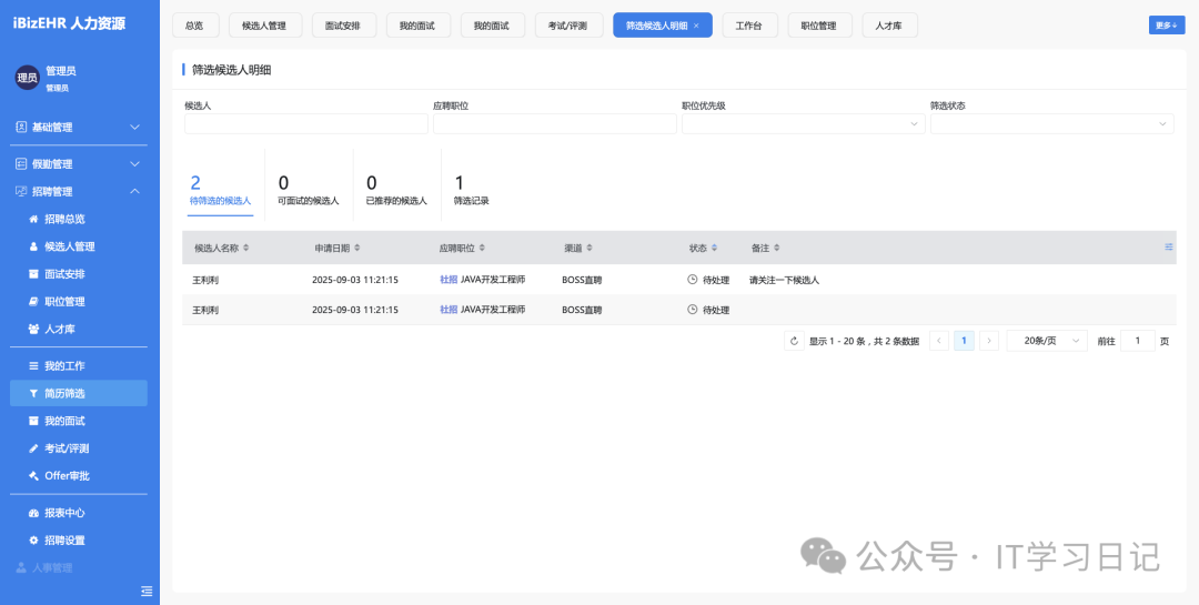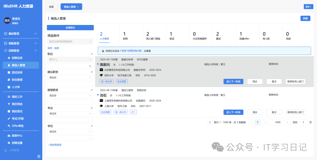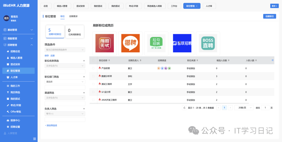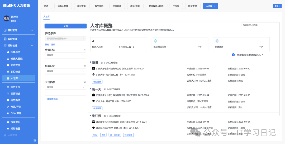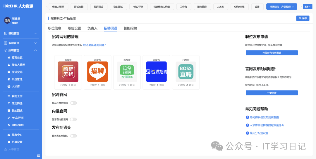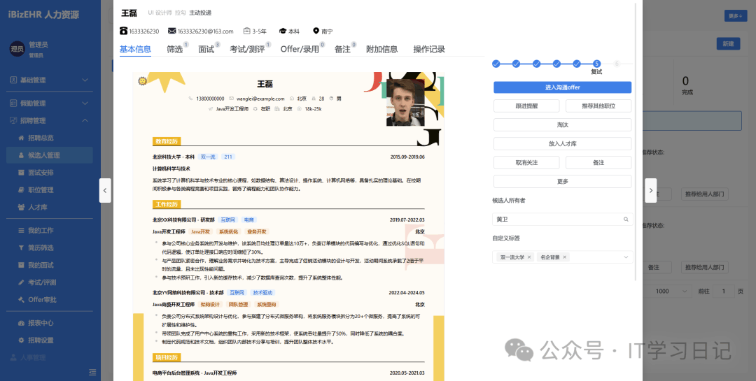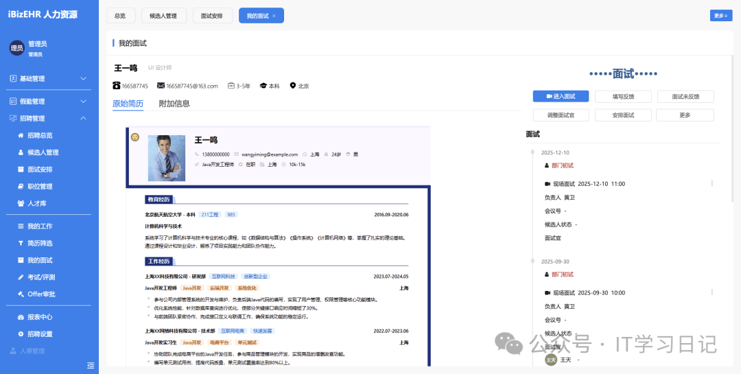 技术栈功能界面招聘管理:覆盖社招、校招、内推、猎头管理等场景,让HR获得更高效的招聘体验、更便捷的协作体验,让管理者获得招聘数据洞见。让招聘降本增效的同时,树立企业在候选人心目中的专业形象。