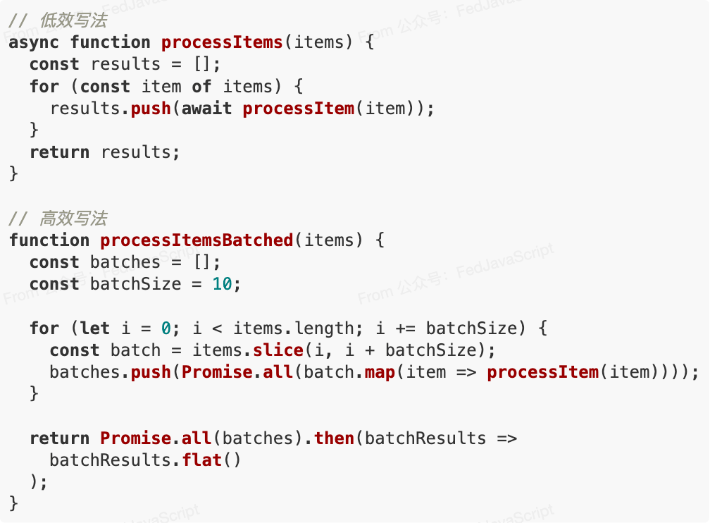 并行执行可以将总执行时间从三个操作的总和减少到最长操作的时间。 3. Promise批处理对于需要处理大量异步操作的场景,使用批处理而非await循环可以显著提高性能: