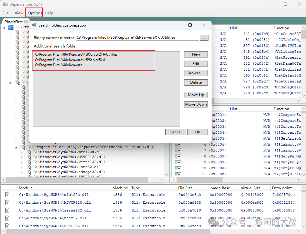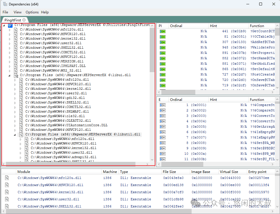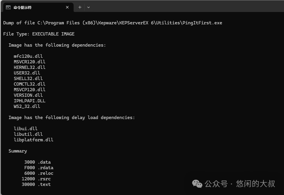 2.使用命令:dumpbin /dependents yourapp.exe 如dumpbin /dependents "C:\Progra~1(x86)\Kepware\KEPServerEX 6\Utilities\PingItFirst.exe" 3.得到结果如下: