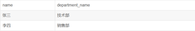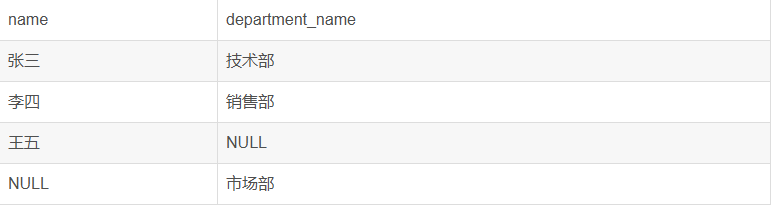 注意:员工“王五”的department_id为NULL,在部门表中找不到匹配项,所以没有出现。部门“市场部”在员工表中没有对应的员工,所以也没有出现。