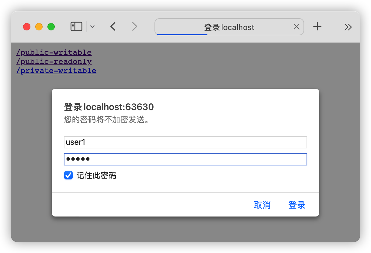└── 1.txt使用浏览器访问 http://localhost:80,就可以看到 3 个不同的 GoWebDAV 服务了。 其中 http://localhost:80/public-writable 是 http://localhost:80/public-readonly 是 http://localhost:80/private-writable 是 当然,除了浏览器,也可以使用其他 WebDAV 客户端工具进行访问。 可以通过指定 ./gowebdav --help # 查看帮助