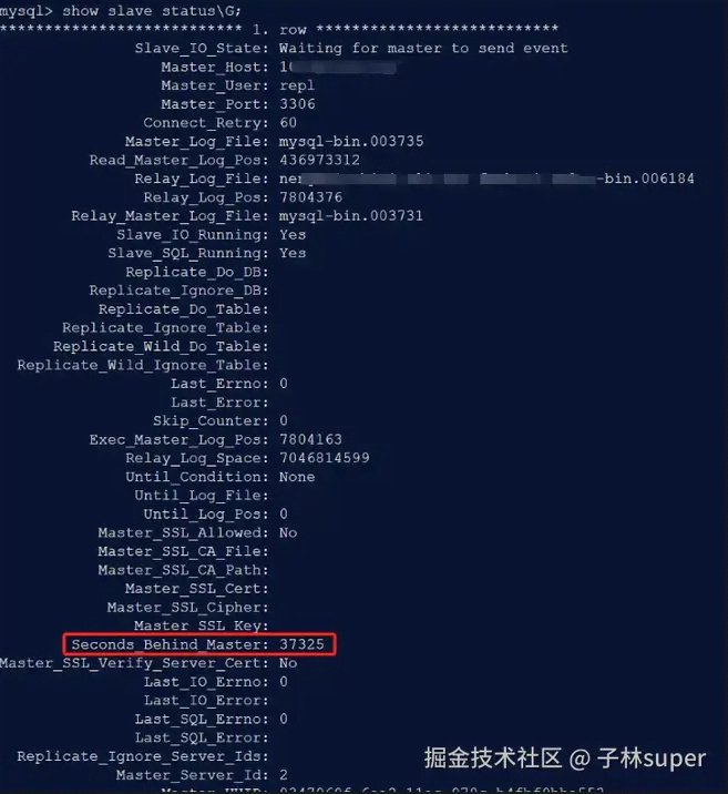 从库落后于主库 37325 秒,主从相差 4 个 binlog。