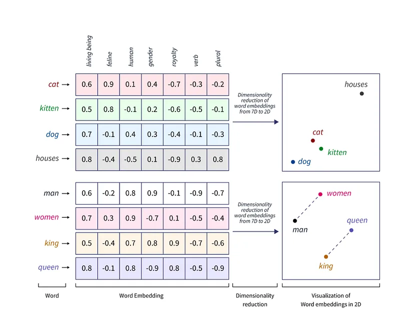 如图可以看到一个完整的提问被分成6个词,拿到分词结果后会根据已经训练好的词表,找到词的对应向量信息,这个过程类似于查字典,找到每个词的含义,最后再加上词的位置信息,结合词的位置信息可以让模型更好的解释词在句子中含义。 词向量是表示自然语言里单词的一种方法,会把每个词都表示为高维空间的向量。通过这种方法,实现把自然语言计算转换为向量计算。同时每个词对应什么向量也是通过模型训练得到的。有一个经典的通过向量对自然语言计算的案例,queen = king - man + women。如下图: 模型运行的第二步:Encoding拿到词向量加上位置编码信息后,下一步就是Encoding的过程。