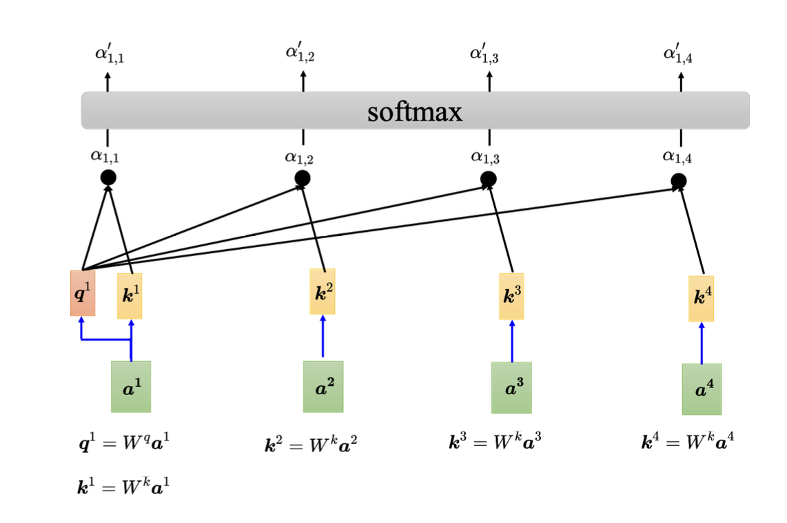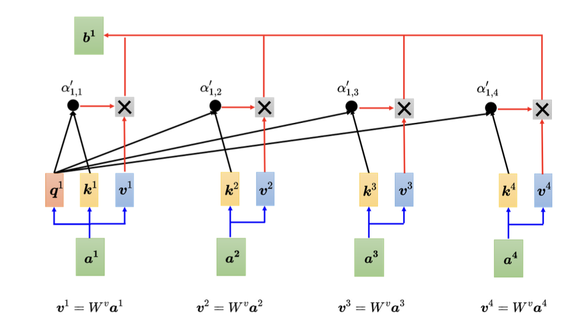 下图表示a1向量经过自注意力变换后得到b1的过程: