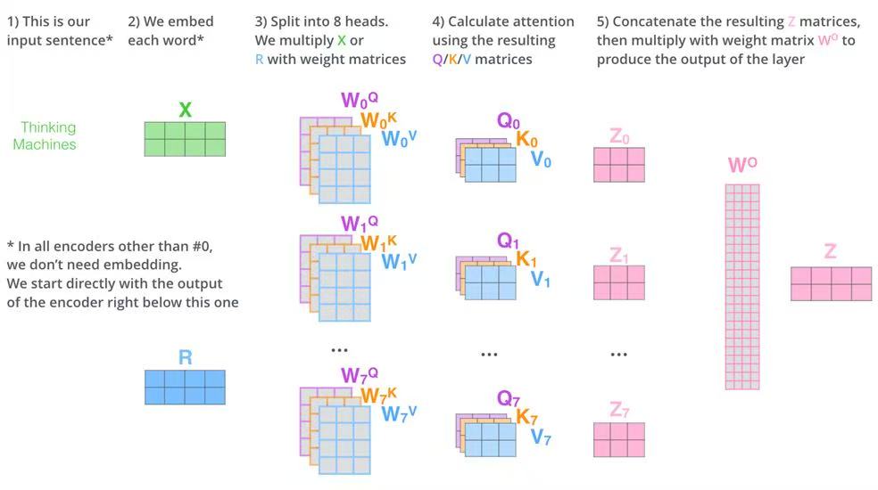 看了上面的计算过程,可以知道经过Q K V三个矩阵的运算,最后每个token的输出向量都是加入了其他token的向量计算,也就是考虑到了其他token,也就是上下文! 了解了自注意机制,多头注意力就是把上面的计算过程拆分为了多个矩阵计算,最后再做合并的过程,计算过程如下: