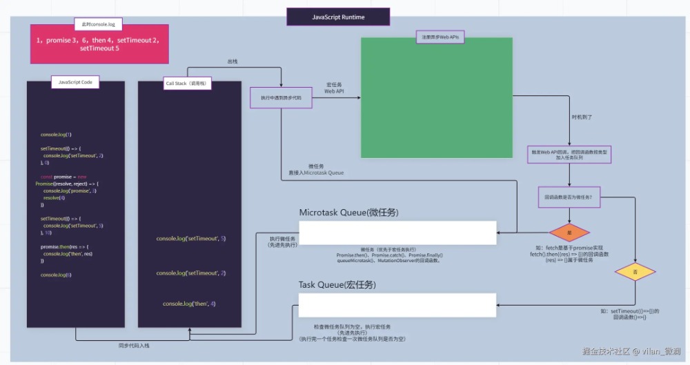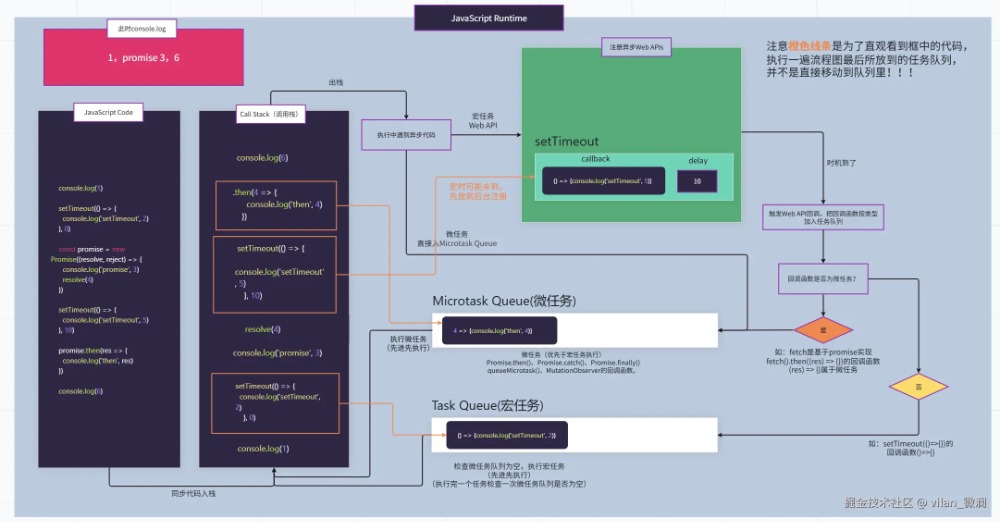 下图当前Call Stack执行栈执行完同步代码后,由于fetch和setTimeout都是宏任务,所以走宏任务Web API流程后注册这两个事件回调,等待定时到后了,由于定时回调是个普通的同步函数,所以放到宏任务队列;等待fetch拿到服务器响应数据后,由于fetch回调为一个Promise对象,所以放到微任务队列。