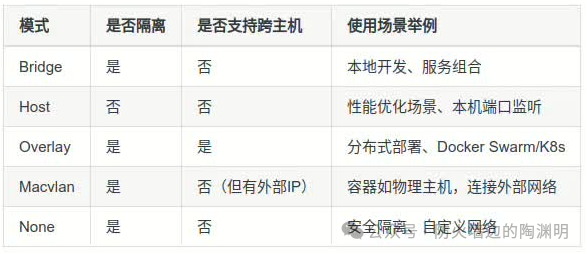如果喜欢“防火墙边的陶渊明”的文章,请记得要把我们“设为星标”哦! ![]() ![]() Docker网络为何如此重要? 容器不是孤岛,通信是刚需,如果没有网络连接,容器之间就无法交流——这时,Docker 网络就成了它们沟通的桥梁。灵活多样的网络模式,支持了多种场景,从本地开发(如bridge网络)到生产环境(如overlay网络跨主机通信),Docker 网络提供统一的抽象层。 Docker 网络是支撑容器通信、服务发现、安全隔离和集群扩展的关键基础设施。 五大网络模式 Bridge(桥接模式) 特点:Docker 默认网络,创建一个虚拟网桥(docker0),容器从 172.17.0.1/16 网段中获得独立 IP,网络隔离性强。 适用场景: