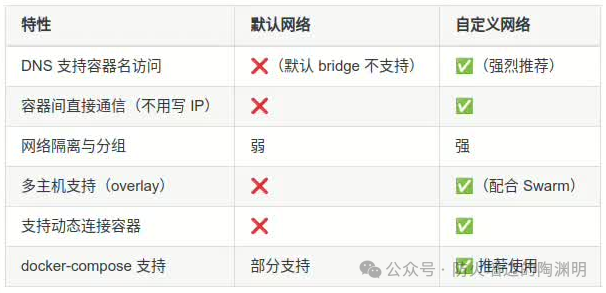 Container让两个容器共享同一个网络命名空间(Network Namespace)。它们共享 IP 地址、端口、路由表等网络配置,实际上等同于“两个进程在同一个容器里”的网络效果,由于太过小众,此处不做讨论。 自定义网络 实际上,正式生产环境通常使用基于原生驱动扩展的用户自定义网络。 用户可以通过 docker network create 来创建自定义网络,但本质仍是基于上述原生驱动(尤其是 bridge 和 overlay)的增强版,既然是增强版,那肯定要优于原版: