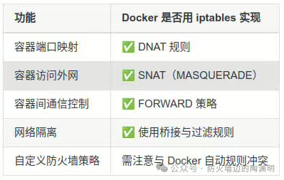 严重依赖iptables Docker的网络功能如此强大,仅靠其自身是很难独立实现的,必须有高人相助,没错,它就是我们的老朋友iptables, 更多信息请参考一文看懂iptables,告别小白防火墙配置! Docker 默认会自动创建和维护iptables规则,无需手动干预,如果你较为关注防火墙规则,肯定会发现启动 Docker 服务后还没开始使用,就出现了一堆新规则。通常使用NAT、Filter表及自定义链来完成相应功能: