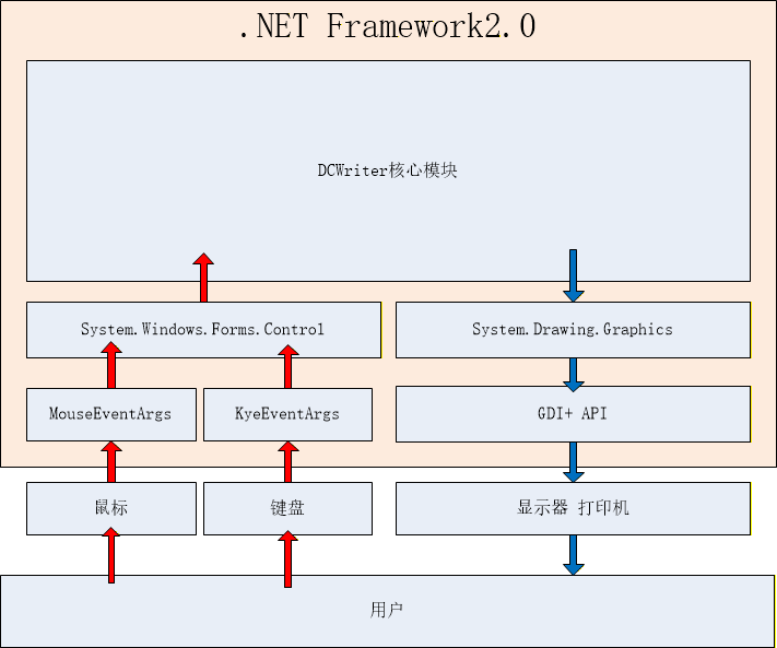 在这个架构图中,System.Windows.Forms.Control和System.Drawings.Graphics是最核心的类型。System.Windows.Forms.Control类型用于将鼠标键盘事件发送给DCWriter核心模块来完成用户互动的操作。而DCWriter核心模块则使用System.Drawings.Graphics类型来绘制用户界面,使得软件和用户互动,形成一个闭环。 参考WinForm.NET程序的基本原理,我们摸索出如下的程序架构: