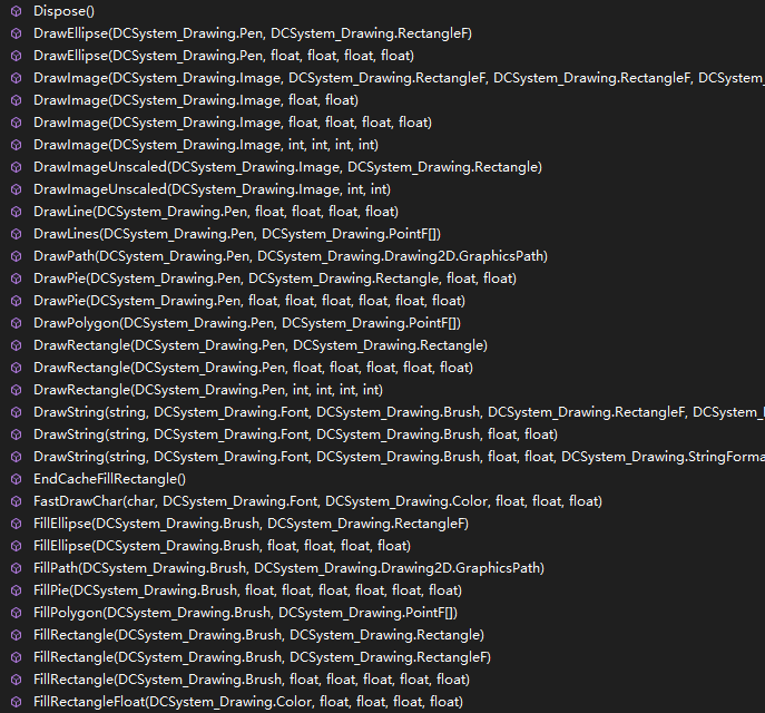 通过这种方式,我们打通了“HTML元素键盘事件->转换器->KeyEventArgs->Control.OnKeyDown->DCWriter核心模块”的事件传递通道。 通过类似的方式,我们打通了鼠标点击、移动、拖拽事件的传递通道。 3.1.2.模拟Control.Invalidate(Rectangle)在 WinForm.NET程序中,Control.Invalidate()也是一个非常重要的成员方法需要模拟出来,为此我们定义以下方法: 1.定义C#方法void Control.Invalidate( Rectangle )方法,则该方法内部使用一个List<Rectangle>来存储多个无效矩形区域,并进行矩形区域的合并操作,减少重绘的工作量。然后通过JSInterop调用无参数的JS函数NeedUpdateView()。 2.定义C#方法[JSInvokeable]public byte[] GetInvalidateViewData(),该函数检索无效矩形列表,获得第一个无效矩形作为ClipRectangle,然后创建Graphcis对象,创建一个System.Windows.Forms.PaintEventArgs对象,调用核心模块的绘图模块来绘制图形,返回包含绘图指令的字节数组,删除第一个无效矩形对象。如果没有任何无效矩形区域,则返回null。 3.定义JS方法 function NeedUpdateView()函数,该函数使用window.setTimeout()来延时调用另外一个JS函数 function DrawContent()。 4.定义JS方法function DrawContent(),该函数通过JSInterop调用C#函数GetInvalidateViewData(),尝试获得绘图指令字节数组。如果存在则调用JS类PageCotentDrawer在HtmlCanvasElement上的指定区域绘制图形。 通过这4个方法以Control.Invalidate() 牵头串联在一起,共同完成用户界面的主动局部重绘的功能。 3.2.模拟System.Drawing.Graphcis类型我们在C#端定义了Graphcis类型,其包含的成员如下所示: