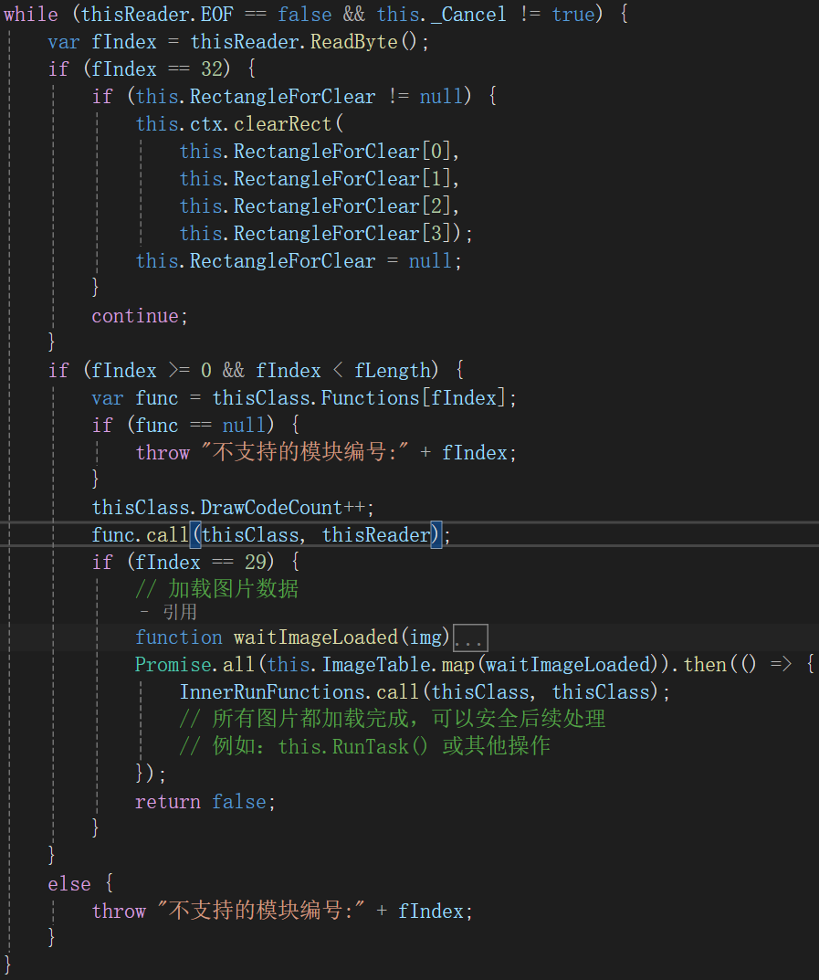 4.基于这些字体快照信息,我们就可以模拟出MeasureString()。实践证明这个方法的计算速度非常快,而且其计算结果与原生MeasureString()的计算结果高度一致。 3.2.2.打印我们会在JS中使用window.print()方法来执行打印,但打印HtmlCanvasElement会出现结果模糊的问题,这是由于打印机DPI远超显示器DPI而导致。因此我们使用SVG的模式进行高清打印。 为此,我们在C#端使用一个SVG指令翻译器来实现该功能。对于Graphics新增SVG打印模式。比如对于Graphics.DrawLine(),当Graphics处于SVG打印模式,则输出的不是二进制数据,而是输出SVG代码,例如<line x1="74" y1="121.5" x2="720" y2="121.5" stroke="Black"></line>。最后将SVG代码字符串传递到JS端,然后使用动态创建SVG元素来承载这些SVG代码,实现高清打印。 3.2.3. JS端DCBinaryReader类我们定义了一个JS类 class DCBinaryReader {}。它在DataView的基础上实现了一个向前的二进制数据读取器。用于简化后续操作。 3.2.4. JS端PageContentDrawer类我们定义了一个JS类class PageContentDrawer{}。它获得C#端Graphics对象生成的二进制数组,使用DCBinaryReader封装一下,然后在一个HTML的CANVAS元素上进行绘制。主体代码如图: