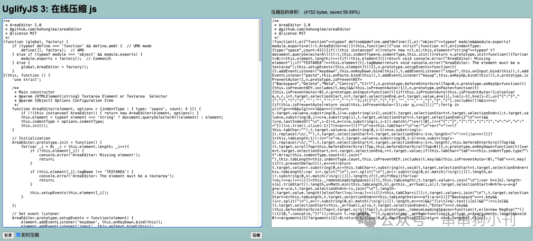 在这里,我使用了 UglifyJS 。它也会智能将代码里的多余的地方优化,以实现尽可能小的体积: