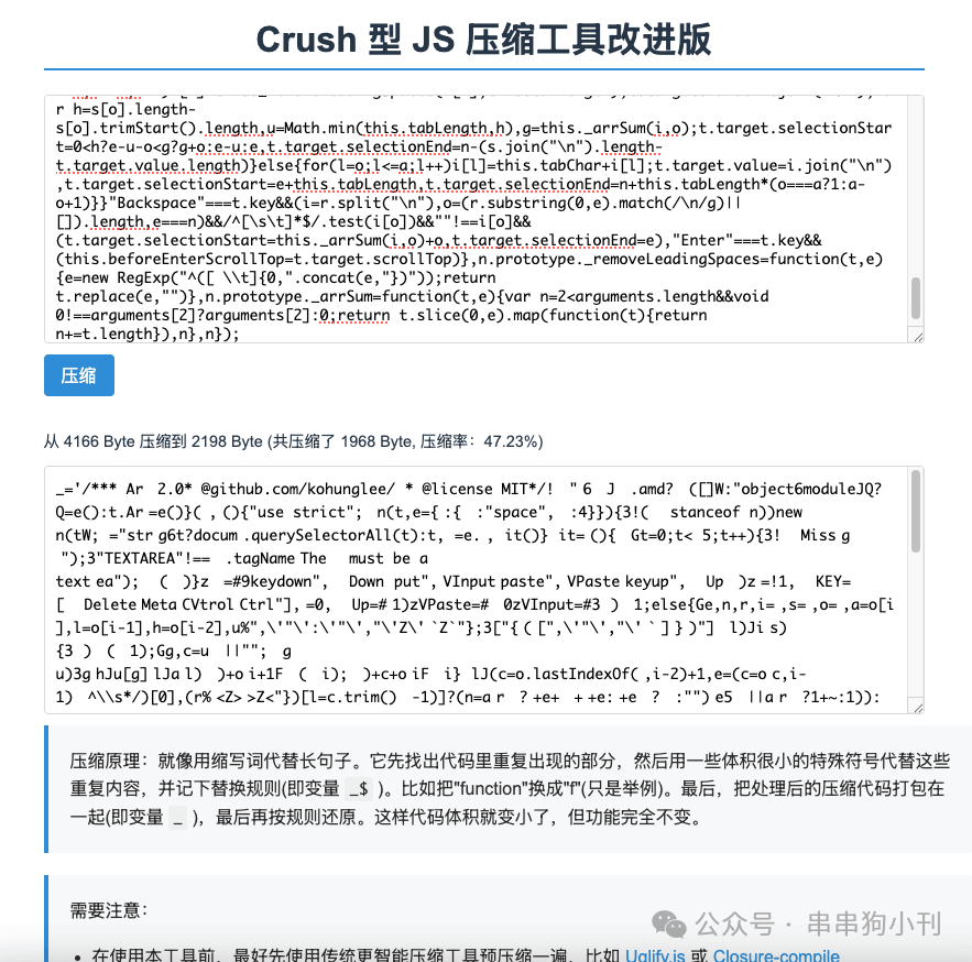使用它生成后的代码,还没有到 2kb 这个阶段,然后我又找到了个利用字母出现频次,构成字典,然后进行压缩的 js 压缩工具。