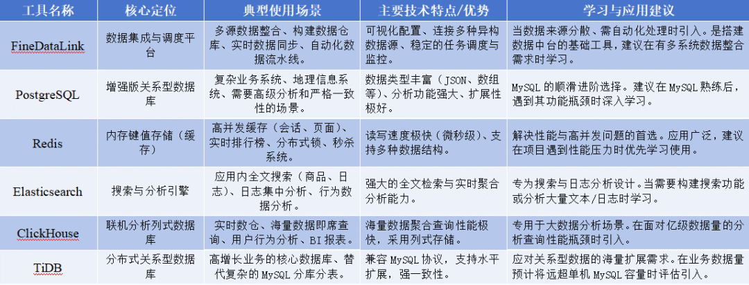 这些经历让我逐渐明白了一个道理:在数据驱动的今天,我们需要的是一个“工具箱”,而不是一把“万能钥匙”。MySQL是里面最重要、最基础的一把螺丝刀,但当你面对需要拧螺母、裁剪板材或者测量精度的工作时,就必须拿出其他专门的工具。