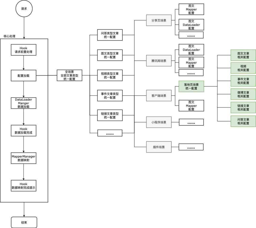 根据请求场景,文章类型加载配置,实现根据不同需求返回不同数据响应,实现差异化配置,分为四层配置体系: