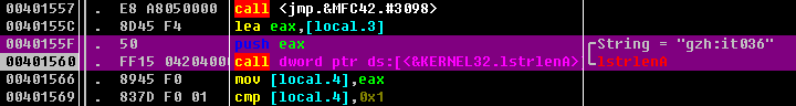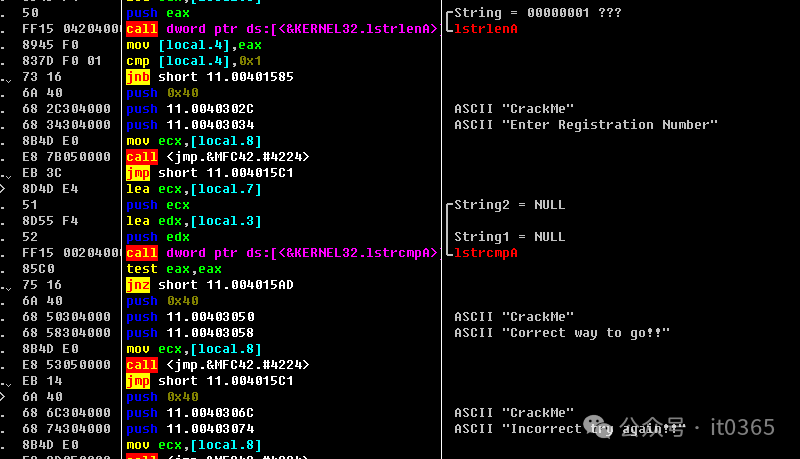 00401585 |> \8D4D E4 lea ecx,[local.7]00401588 |. 51 push ecx ; /String2 = "<BrD-SoB>"00401589 |. 8D55 F4 lea edx,[local.3] ; |0040158C |. 52 push edx ; |String1 = "gzh:it036"0040158D |. FF15 00204000 call dword ptr ds:[<&KERNEL32.lstrcmpA>] ; \lstrcmpA00401593 |. 85C0 test eax,eax00401595 |. 7516 jnz short 11.004015AD00401597 |. 6A 40 push 0x4000401599 |. 6850304000 push 11.00403050 ; ASCII "CrackMe"0040159E |. 6858304000 push 11.00403058 ; ASCII "Correct way to go!!"004015A3 |. 8B4D E0 mov ecx,[local.8]004015A6 |. E8 53050000 call <jmp.&MFC42.#4224>