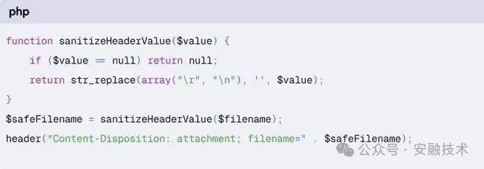 5. 安全审计和监控: • 定期审计:定期对应用程序进行安全审计,发现和修复潜在的CRLF注入漏洞。 • 监控日志:监控应用程序的日志,及时发现和响应异常行为。 6. 使用标准API: • 标准API:使用标准的API设置文件名或响应头,避免直接拼接用户输入。 • 示例: