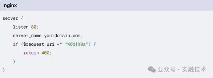 7. 全局参数过滤: • 全局Filter:通过一个全局Filter,对所有参数进行一次性清洗。 • 示例: class CRLFSanitizerFilter implements Filter { public function doFilter(ServletRequest $req, ServletResponse $res, FilterChain $chain) { $request = new HttpServletRequestWrapper($req); $chain->doFilter($request, $res); } } 8. Nginx配置: • 拦截请求:通过Nginx配置,拦截包含CRLF字符的请求。 • 示例: