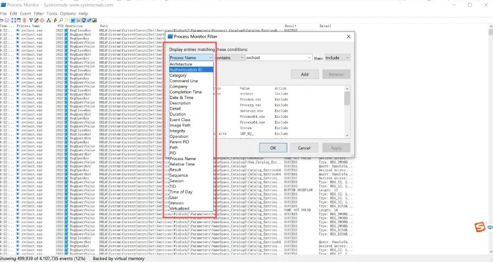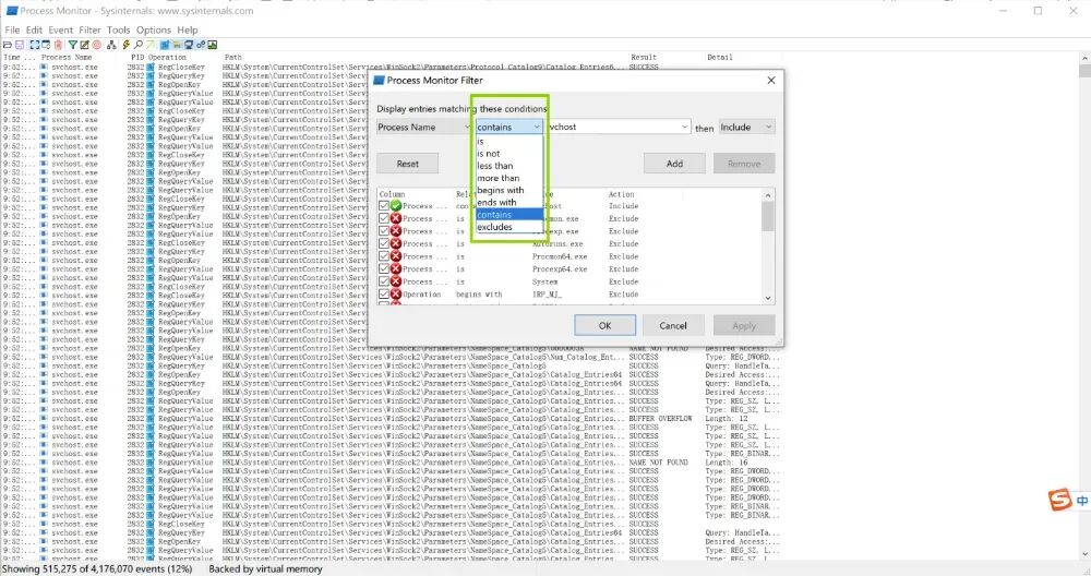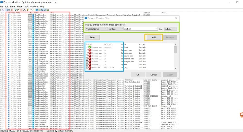 Procmon 使用十分直观,但为了高效捕获关键行为,通常需要遵循“启动前准备、实时监控、结果分析”三个步骤。启动工具后,默认会立即开始捕获所有系统事件,建议先暂停捕获并清空历史记录,再根据实际分析场景设置过滤器。常用过滤条件包括进程名、操作类型(如 CreateFile、RegSetValue)、路径关键字以及返回结果等,可显著减少噪声日志,提高分析效率。开启捕获后,Procmon 会以时间序列展示实时事件,用户可通过高亮、堆栈查看、事件属性等功能快速定位异常操作,如可疑文件落地、注册表持久化写入、DLL 加载异常、进程链条变化等。分析完成后,可将记录保存为 PML 文件用于复盘或证据留存。通过合理的过滤与事件关联,Procmon 能帮助用户迅速构建行为链,准确识别潜在安全风险与攻击迹象。通过行为过滤聚焦可疑进程事件,并依托进程创建链重构其调用路径,为恶意进程溯源与攻击链分析提供关键依据。如:进程名包含svchost 的事件,添加到规则内进行应用查找。通过多字段、多维度的组合过滤,将海量系统事件快速收敛为关键行为片段,精确复原进程的调用链与操作序列,为可疑进程识别、恶意行为判定和攻击链精准溯源提供可靠依据。在 Windows 主机入侵排查场景中,Procmon 以其对系统底层行为的深度可见性,成为安全人员定位异常活动的关键工具。依托强大的字段组合过滤机制,Procmon 能在海量事件中迅速聚焦可疑进程的关键操作,如文件落地、注册表篡改、权限更改、异常网络调用与恶意 DLL 加载等行为,并通过进程创建链清晰还原攻击者的执行路径。无论是初始入侵验证、持久化排查、横向移动分析,还是恶意样本行为研判,Procmon 都能帮助分析人员从行为层面锁定真实威胁,精准复现攻击链条,为应急响应和后续处置提供强有力的证据支撑,是 Windows 主机安全分析中不可或缺的核心工具之一。