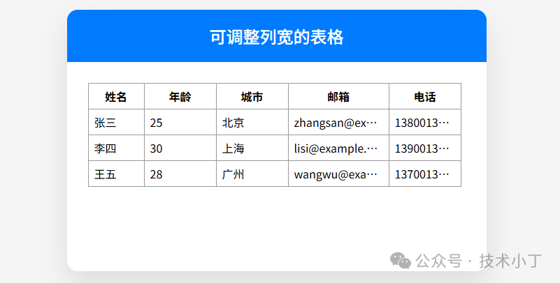 页面通过 .wrap 区域实现了横向滚动条的支持,防止表格溢出屏幕。使用 table-layout: fixed 来固定表格布局,使我们可以控制每列的具体宽度。在每个 th 元素的右边添加了一个伪元素 ::after 作为调整手柄,只有当鼠标悬停时才可见。<div class="wrap"> <table class="resizable-table" id="resizableTable"> <thead> <tr> <th style="width: 80px">姓名</th> <th>年龄</th> <th>城市</th> <th style="width: 150px">邮箱</th> <th>电话</th> </tr> </thead> <tbody> <tr> <td>张三</td> <td>25</td> <td>北京</td> <td>zhangsan@example.com</td> <td>13800138000</td> </tr> </tbody> </table></div>