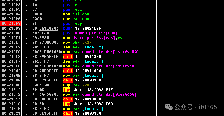 继续学习软件逆向破解反汇编技术零基础入门实战12篇! 这次学习的这个CRACKME同样是反汇编逆它的注册码或写出注册机算法代码。 软件要求输入正确的用户名和密码完成注册,错误的注册码直接报错这是Delphi开发的软件,最直接找按钮事件可以用反编译软件DeDeDark就能快速找到关键位置了。 估计我系统原因,无法打开这软件。就用最低效率的方法了。直接查找有没关键的字符串找位置,实在不行就翻代码,在每个功能代码前下个断点,看它在哪里断下。盲找! 点击反汇编窗口,右键选 中文字符搜索,把强制模式打开,再选智能搜索 。没发现什么有用的字符, 提示错误或正确的字符都没有。估计是重编码了字符,无法搜索到了。只有个红色箭头的,双击进去看看。看到反汇编代码后下断点,但是点击程序后,断点未断下,说明这里不是关键位置,向上翻找找其它函数段头下断点(F2)00421DF2 |. E8 89FAFEFF call 12.0041188000421DF7 |. 8D55 FC lea edx,[local.1]00421DFA |. 8B86 AC010000 mov eax,dword ptr ds:[esi+0x1AC]00421E00 |. E8 7BFAFEFF call 12.0041188000421E05 |. 8B45 FC mov eax,[local.1]00421E08 |. E8 5715FEFF call 12.0040336400421E0D |. 83F8 04 cmp eax,0x4