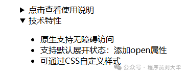 details[open] 选择器定制展开样式 - • 支持键盘操作(Enter/Space 触发),无障碍友好