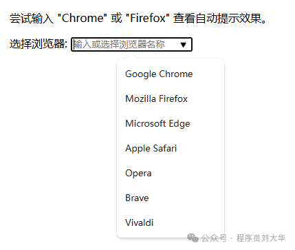 <input list="browsers" placeholder="选择或输入浏览器">