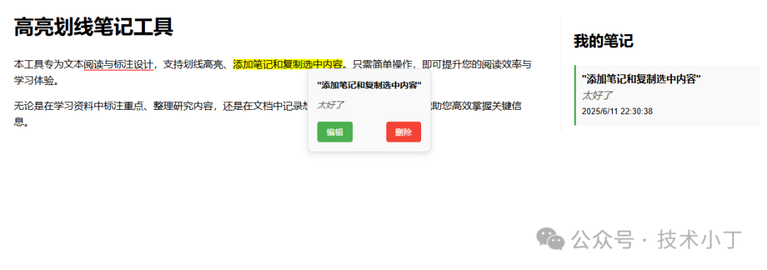 当用户点击已高亮的文本时,显示对应的笔记内容和操作按钮。包含被高亮的原文和添加的笔记内容。提供“编辑”和“删除”按钮,用于对笔记进行修改或移除操作。<div id="note-popup" class="note-popup"> <div class="note-content"></div> <div class="note-text"></div> <div class="note-actions"> <button class="edit">编辑</button> <button class="delete">删除</button> </div></div>