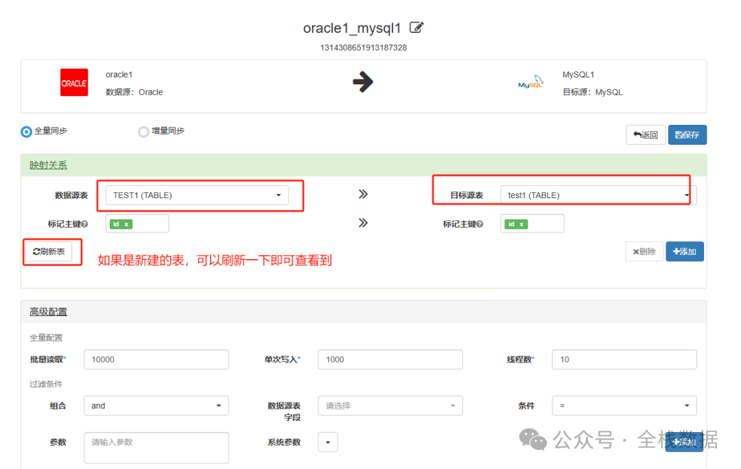 在当今数据驱动的时代,企业每天都在产生、接收和处理海量信息——从用户行为日志到交易记录,从IoT设备数据到跨系统业务指标。然而,数据的价值并不在于“拥有”,而在于“可用”与“可信”。这正是现代ETL(Extract, Transform, Load)数据同步工具的核心使命。 一款高效、智能的ETL工具,不仅是连接异构数据源的“桥梁”,更是保障数据一致性、时效性与准确性的“中枢神经系统”。它能够自动化地从数十个源头抽取原始数据,在毫秒级内完成清洗、转换与标准化,并精准加载至数据仓库、湖仓一体平台或AI训练管道中,让决策者随时掌握“此刻的真实”。 更重要的是,在实时分析、个性化推荐、风控预警等关键场景中,延迟几秒的数据可能意味着错失百万商机或重大风险失控。而先进的ETL同步工具通过低延迟、高容错、可监控的架构,确保数据流如血液般畅通无阻,为企业注入敏捷、智能与竞争力。 简言之:没有可靠的ETL,就没有可信的数据;没有可信的数据,就没有真正的数字化转型。选择一款强大的数据同步ETL工具,不是技术选型,而是战略投资——投资于未来每一项以数据为基石的创新与增长。 Part.1 工具简介 DBSyncer是一款开源的数据同步中间件,提供MySQL、Oracle、SqlServer、PostgreSQL、Elasticsearch(ES)、Kafka、File、SQL等同步场景。支持上传插件自定义同步转换业务,提供监控全量和增量数据统计图、应用性能预警等。 工具特点 组合驱动,自定义库同步到库组合,关系型数据库与非关系型之间组合,任意搭配表同步映射关系 实时监控,驱动全量或增量实时同步运行状态、结果、同步日志和系统日志 开发插件,自定义转化同步逻辑 产品架构图 Part.2 界面预览 Part.3 使用手册 1、安装配置 dbsyncer-x.x.x.zip 社区版安装教程 dbsyncer-enterprise-x.x.x.zip 专业版安装教程 方式一 下载安装包 安装JDK 1.8(省略详细) 下载安装包dbsyncer-x.x.x.zip(也可手动编译) 解压安装包,Window执行bin/startup.bat,Linux执行bin/startup.sh 打开浏览器访问:http://127.0.0.1:18686 账号和密码:admin/admin 方式二 🐳 docker 阿里云镜像 docker pull registry.cn-hangzhou.aliyuncs.com/xhtb/dbsyncer:latestdocker pull registry.cn-hangzhou.aliyuncs.com/xhtb/dbsyncer-enterprise:latestdocker pull registry.cn-hangzhou.aliyuncs.com/lifewang/dbsyncer:latest 运行命令 docker run -d -p 18686:18686 -v ./your_path/data:/app/dbsyncer/data -v ./your_path/plugins:/app/dbsyncer/plugins --restart=unless-stopped -e TZ="Asia/Shanghai" --name=dbsyncer registry.cn-hangzhou.aliyuncs.com/xhtb/dbsyncer:latest ⚙️手动编译 先确保环境已安装JDK和Maven $ git clone https://gitee.com/ghi/dbsyncer.git$ cd dbsyncer$ chmod u+x build.sh$ ./build.sh Part.3 性能测试 Part.4 产品使用 推荐机器配置:内存8GB,4core,磁盘60GB(建议上好点的SSD) 本次在Linux服务器上进行部署 1.1部署JDK 根据官方文档指引,需要安装JDK8,具体可以自行在官方下载安装 我使用的8.0.191也可以 1.2 下载安装包并进行部署 启动DBSyncer分社区版记专业版,如果想试用专业版功能可以自行测试,本文将使用社区版进行测试。下载:社区版下载地址:https://gitee.com/ghi/dbsyncer/releases为了体验新特性及优化后的功能,可以下载最新版本,当前最新版本为2.0.4,选择并进行下载 wget https://gitee.com/ghi/dbsyncer/releases/download/v2.0.4/dbsyncer-2.0.4-bin.zip 解压、启动:unzip dbsyncer-2.0.4-bin.zip bin目录下有启停脚本、执行运行即可 启动 sh startup.sh 看到“Start successfully!”即启动成功 启动后的管理页面可以通过 http:// ip:18686进行登录查看,默认管理账号密码为 admin/admin 2. 数据迁移 2.1 准备工作 本次测试的是从Oracle迁移数据至MySQL,因此先在Oracle数据库中创建一张表及测试数据,在MySQL数据库中也创建一张表 Oracle库: CREATE TABLE test1(id int ,c1 varchar(20)) INSERT INTO test1 values(1,'a'); INSERT INTO test1 values(2,'b'); commit; MySQL库: CREATE TABLE test1(id INT PRIMARY KEY ,c1 VARCHAR(20)); 2.2 配置数据源 配置一个名为oracle1的数据源,对应填写连接信息、账号密码等,完成后保存即可 如果保存时不报错,则说明连接添加成功,如果保存过程中有错误,则按照错误信息进行解决。 再配置一个MySQL数据源作为目标库,MySQL的连接URL里要注意库名的配置 保存后即可在界面上看到对应的数据源 2.3 配置迁移任务 这个版本点击“添加驱动”进行数据迁移任务的配置(建议修改名称,以免有误解) 先选择源目数据源,并配置一个任务名称