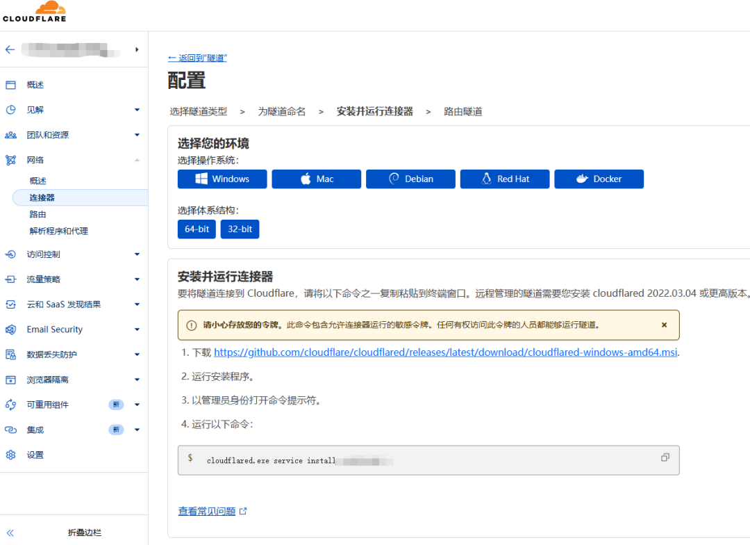 这样做有三个巨大的好处: 1.完全免费:只要你有域名,带宽和流量都不收钱。 2.安全性爆表:你甚至可以关闭路由器的所有入站端口,黑客根本扫不到你的真实 IP。 3.自带 HTTPS:不用自己去申请 SSL 证书,Cloudflare 自动给你加上小绿锁。 操作起来比你想象的容易: 首先,确保你的 dnshe 域名已经托管到了 Cloudflare。 然后,在 Cloudflare 后台找到 Zero Trust 面板,点击 Networks(网络) -> Tunnels(连接器),创建一个新隧道。 系统会给你一行安装命令。不管你是 Windows、Mac 还是 Linux,复制这行命令在终端里运行一下,`cloudflared` 客户端就会自动安装并连接。