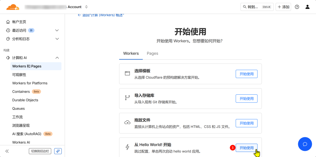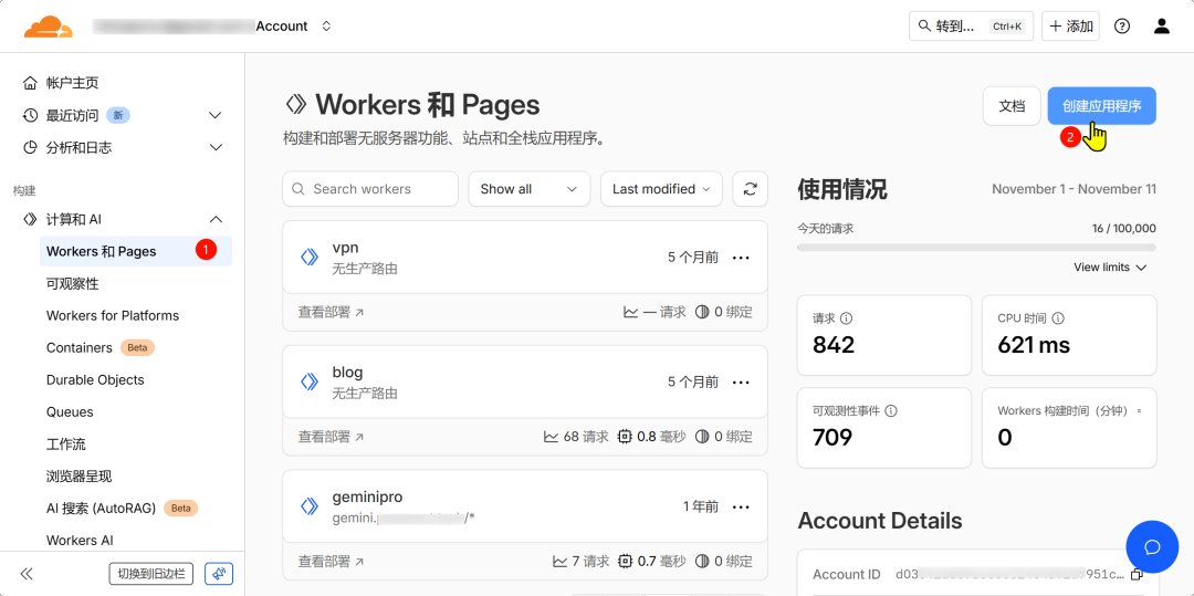 - 1. 登录Cloudflare,点击左侧菜单Workers和Pages,点击创建应用程序