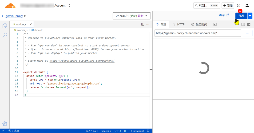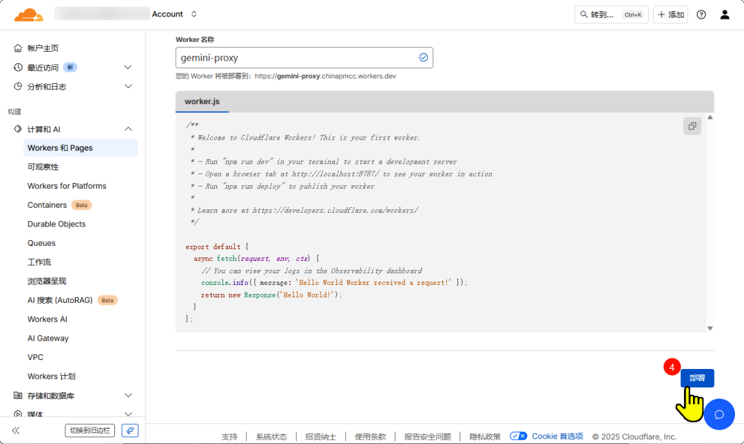 - 3. 给worker起个自己中意的名称,这里叫gemini-proxy;然后点击下方部署按钮。