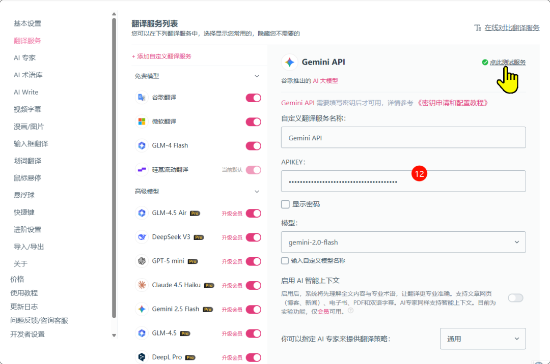 - 9. 验证并应用,配置时用到两个东西:API KEY、API 地址 经过上述配置,就可以使用Gemini了,下面通过两个应用例子验证,在其他应用中使用也是一样的方法。