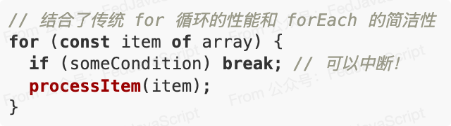 for...of 提供了几乎与 forEach 相同的简洁语法,同时保留了使用 break、continue 和 return 的能力。