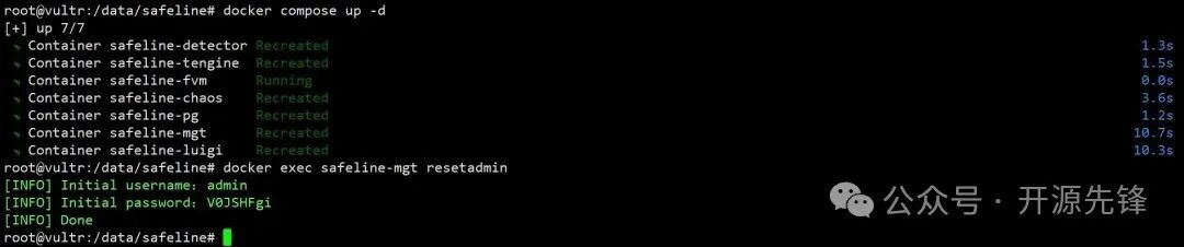 安装方式官方给了两种方式: 1、一键安装执行下面的命令,按提示完成安装目录设置等操作,安装成功后直接进入Web UI配置。 2、手动 Docker 部署开源君就是用这个方法进行部署的,先创建安装目录,并下载配置文件: 然后编写.env文件(示例内容): 最后启动服务,等待安装部署完成。 等待安装部署完成后,使用这个命令获取管理员账号密码: