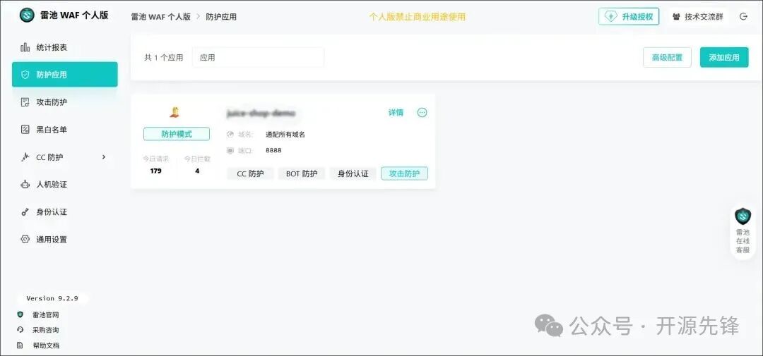 在“防护应用”模块可以添加需要防护的应用并进行配置,开源君搭建的8888端口页面就是在这里进行配置的。