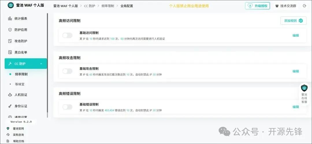 同样也可以左边栏里面进行全局配置 CC 防护,人机验证,身份认证等功能。 小结作为一款优秀的国产开源 WAF 神器,SafeLine 完美平衡了防护效果、使用便捷性和经济性。它不仅能有效抵御各类 Web 攻击,还提供了丰富的配置选项和直观的管理界面,社区版永久免费,功能完全满足日常防护需求。如果你正在为网站安全发愁,又不想投入高额成本,不妨试试这款 Github 高星开源项目,让 SafeLine 为你的 Web 服务保驾护航! 更多细节功能,感兴趣的可以到项目地址查看: 阅读原文:原文链接 该文章在 2025/12/31 10:28:22 编辑过 |